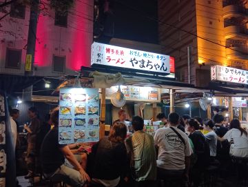 | 〆のラーメンをねらって中州屋台横町へ向かったのですが、どこも一杯。 結局、別の所で食べることに。 |