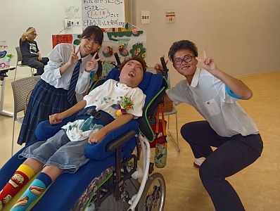 熊野高校のボランティアさんとハンドメイドを楽しんだ 後、お決まりの記念写真。みんな17歳なんだって! 俺も年を取ったな〜。 |