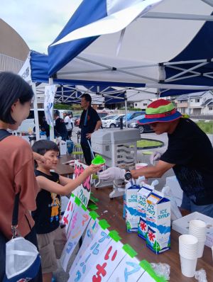 海パパも、前日は荷物運搬をお手伝い。 当日はかき氷屋さんになり大活躍。 うどん、たこ焼き、ベビーカステラ、いろ んなブースがあったけど、暑さもあって大 繁盛。「シロップはなに味、ミルクは掛け る?」お客さん対応もばっちりでした。 |