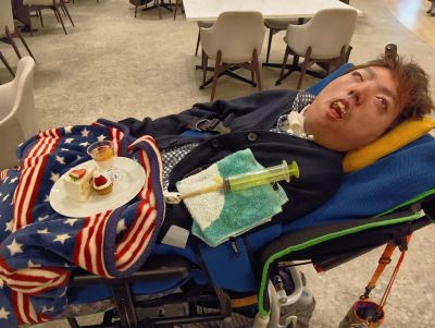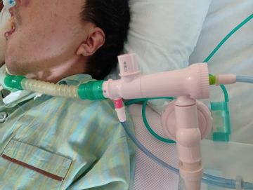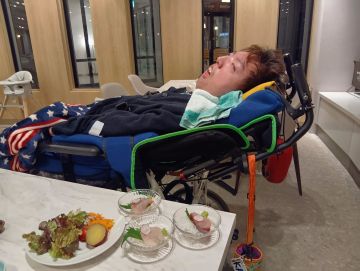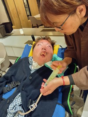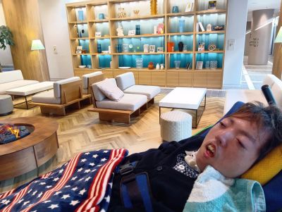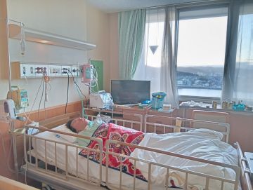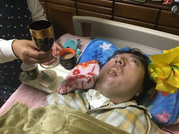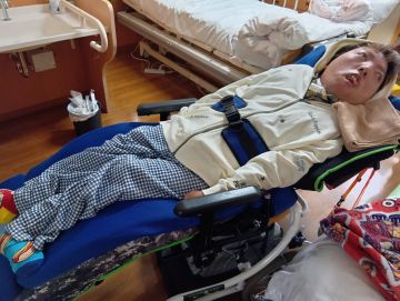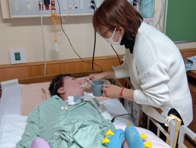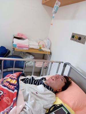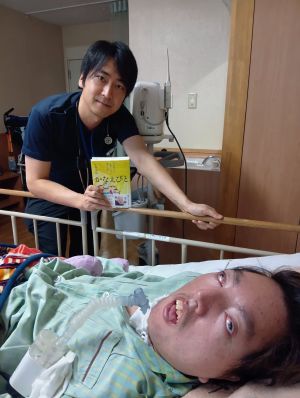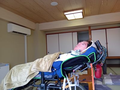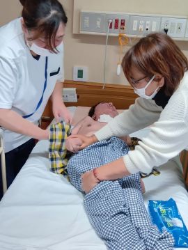 | 東広島医療センターへの入院は3年ぶりです。ここしばらくは体調も良く 入院は久々ですが、早い入院でよかったです。先生たちの適切な処置に より、少しづつ楽そうになっていきます。 医療センターにはIPVがないので、自宅より病室に搬送し、毎日行いま した。 |