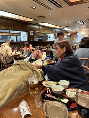海くんはミキサーに掛けてもらってガッツリ。海パパ は冷酒をいただきます。 |