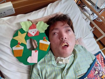 | クリスマスまでには退院したいです!主治医の草本先生にお願いした海くん。 病室でクリスマスリースを作りました。 |