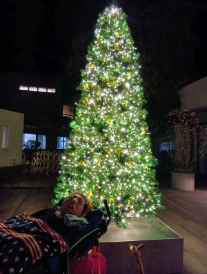 食後は夜のお散歩。エントランスの クリスマスツリー前で記念撮影。 |