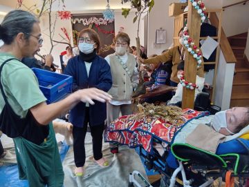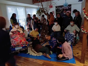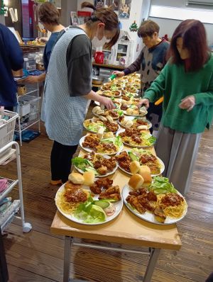 | 医療センターを後にした海くんは、クリスマスパーティーが開かれている ともあるへ直行。会場では”前衛生け花”の真っ最中。 |