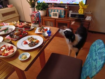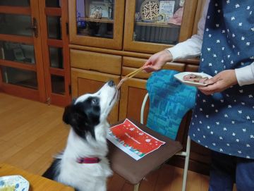 | ピースも気になるのか、クンクンにおっています。「大丈夫 あなた用のお肉も用意しているからね」 |